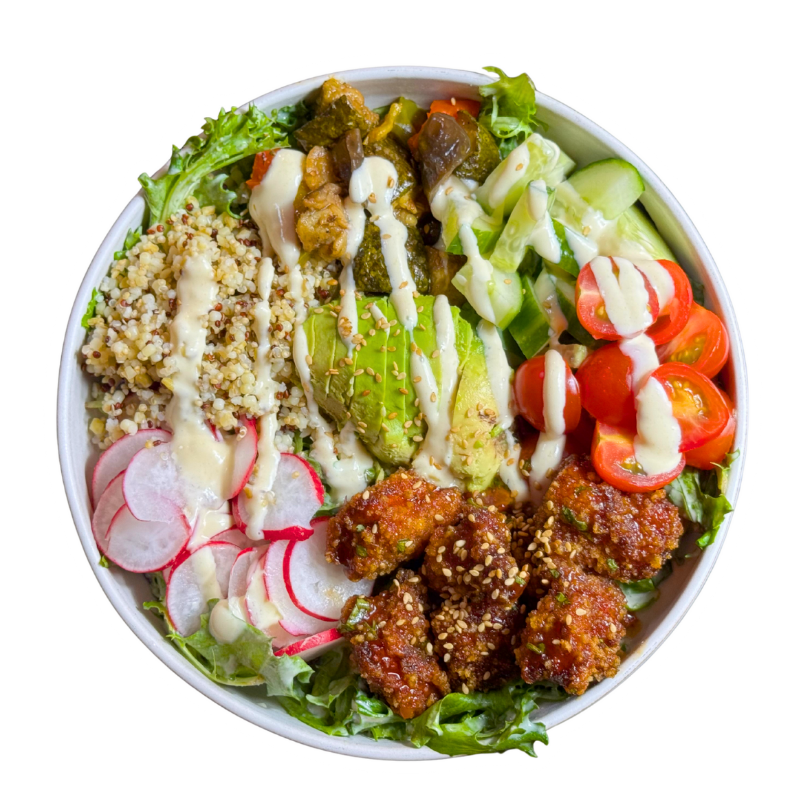 Salade, avocat, tomate cerise, concombre, radis, poilé de légume, poulet ou crevette.