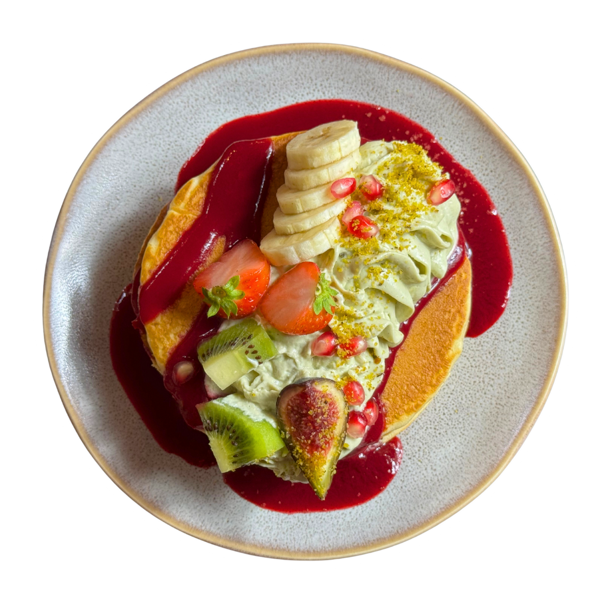 Pancakes, chantilly pistache et fruits rouges.